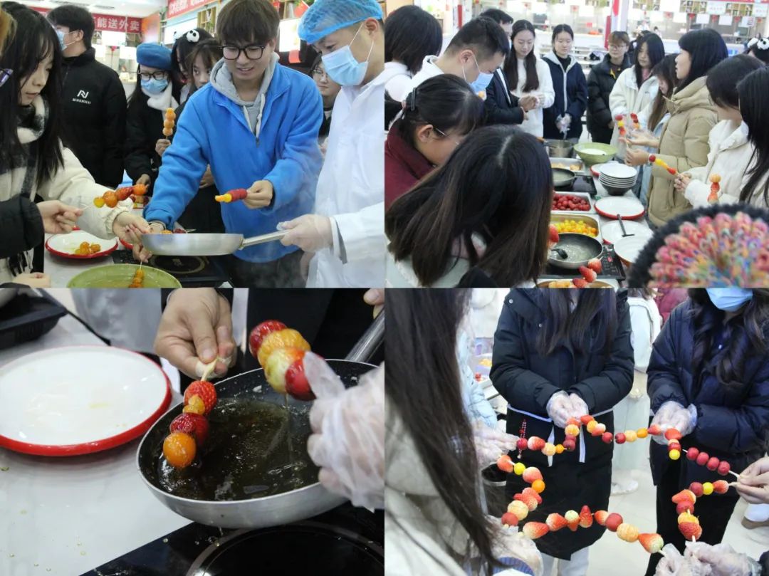 另一边,糖葫芦的制作区亦是香气四溢。同学们围聚在一起,将山楂、橘子、草莓、葡萄仔细串在一起,再裹上一层晶莹剔透的糖衣,令人垂涎欲滴。