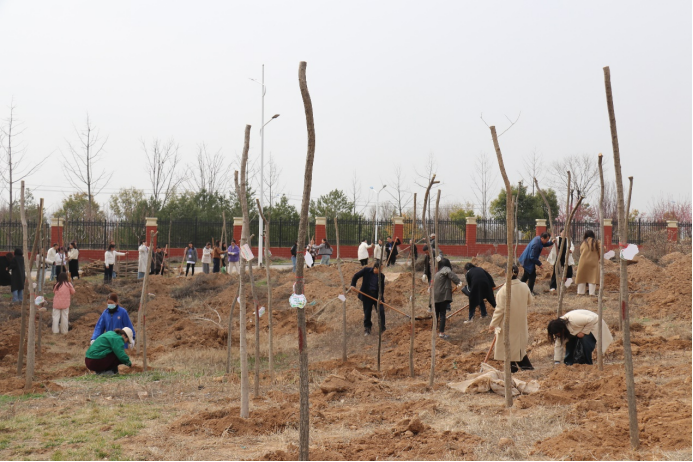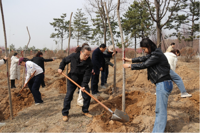 仪式结束后,全体学员与继续教育学院教职工前往富平校区共同开展“聚培训能量 植成长之树为教育添绿”主题植树活动。学院教工与学员们挥锹铲土、扶苗浇水,亲手种下象征希望与成长的国槐树苗。经过两小时协作,116余株新绿昂然挺立,每棵树苗挂上了专属“成长牌”,记录下学员们的寄语与期许。