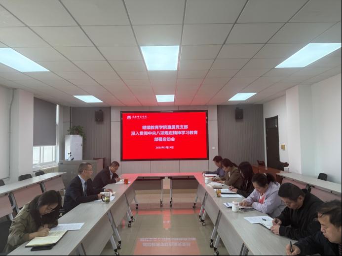 3月24日上午,继续教育学院直属党支部召开深入贯彻中央八项规定精神学习教育部署启动会。继续教育学院党员干部参加了部署动员会。直属党支部书记周德锋主持会议。