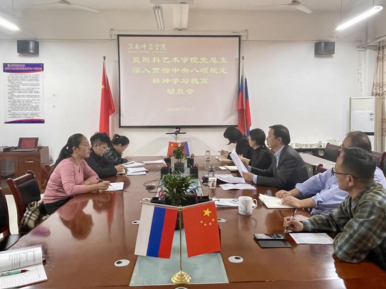 3月24日下午,莫斯科艺术学院党总支召开深入贯彻中央八项规定精神学习教育动员会议。学院全体处科级干部、党支部书记参会,会议由学院党总支书记孟波主持。