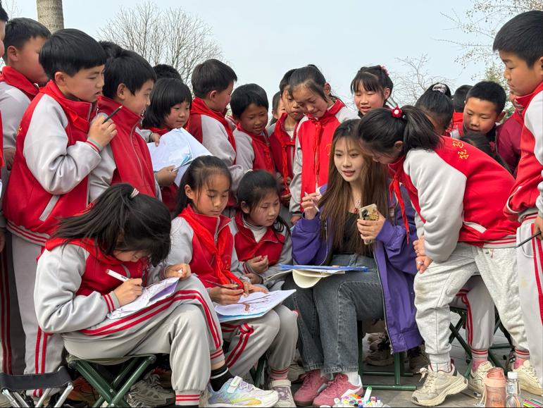 在“大手拉小手”写生互动环节,传媒学子与富平县淡村镇仲勋学校学生们携手开展艺术创作。大学生凭借扎实的专业功底,用细腻笔触勾勒出故居的古树庭院、地窖木窗,将历史的沧桑与时代的变迁定格在画卷之上;小朋友们则以天马行空的想象力,精心描绘心中的“英雄家园”,色彩斑斓的画作中饱含着对红色文化的纯真热爱与独特理解。艺术创作与历史教育在这里深度融合,红色记忆在两代学子之间接力传递,信仰的种子也在他们心中生根发芽。