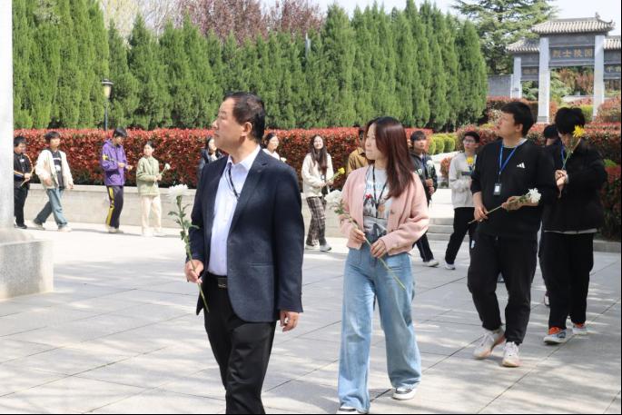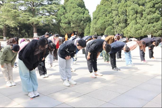 活动在庄严的国歌声中拉开帷幕,全体人员面向渭华起义烈士纪念碑,对英勇献身的革命先烈致以最崇高的敬意。国歌唱毕,全场肃立,党员代表将花篮缓缓抬至纪念碑前,学院党总支书记武江波上前整理花篮缎带,全体师生在工作人员带领下向革命烈士敬献菊花,面向纪念碑三鞠躬、默哀致敬,寄托对革命先烈的崇高敬意和深切哀思。