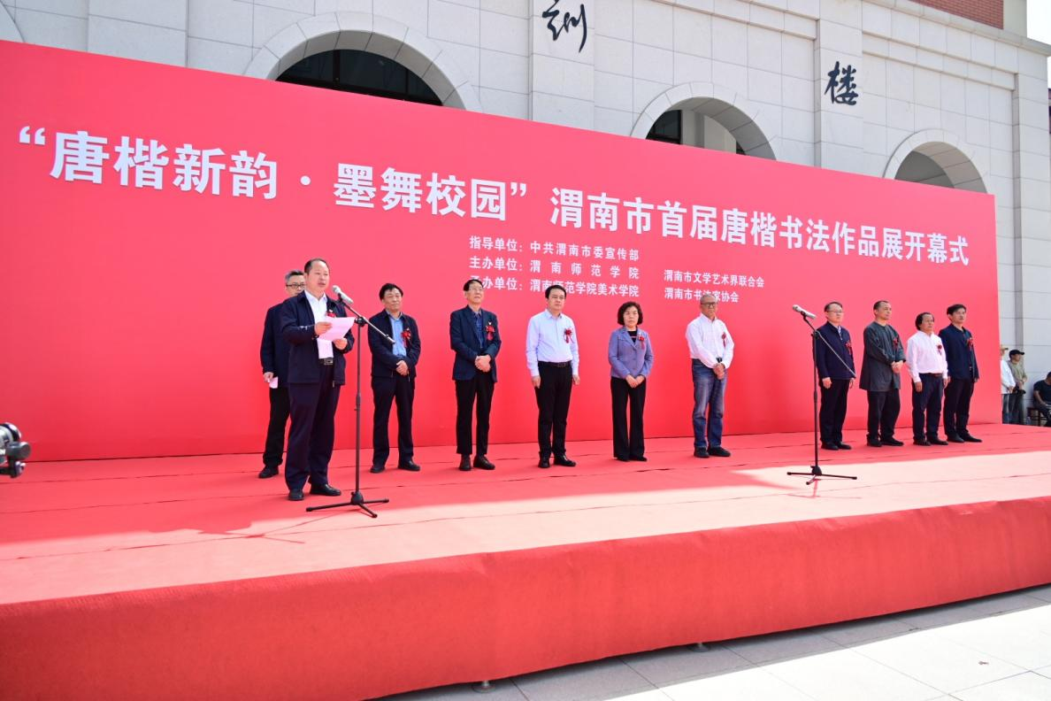 4月10日下午,由渭南市委宣传部指导,best365中国官方网站与渭南市文学艺术界联合会主办,best365中国官方网站美术学院与渭南市书法家协会共同承办的“唐楷新韵·墨舞校园”渭南市首届唐楷书法作品展在best365中国官方网站富平校区开幕。党委副书记汪勇、副校长王菊霞、陕西省书法家协会副主席金石拓本委员会主任张鉴宇、中共渭南市委宣传部副部长兰勇、渭南市文学艺术界联合会主席张力、渭南市书法家协会主席薛小虎等人出席开幕式。