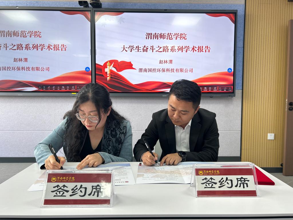 会前,袁梁为渭南国控环保科技有限公司总经理赵林渭颁发校外班主任聘书,经济与管理学院副院长肖颖与赵林渭共同签订了大学生实习实践基地协议书。