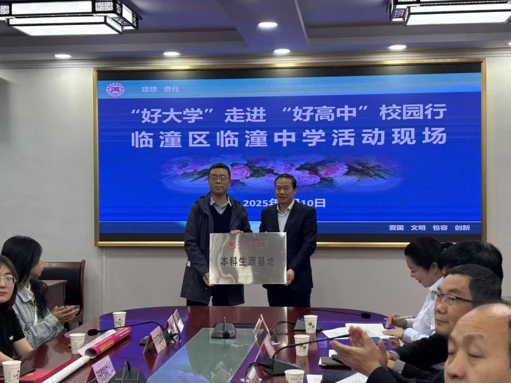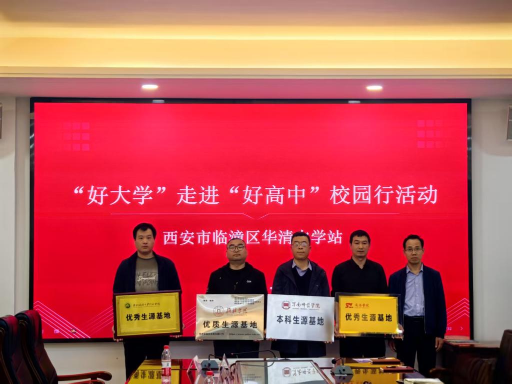 活动期间,张佳凡、崔鹏两位老师代表学校分别向陕西省周至中学、西安市临潼区临潼中学、西安市临潼区华清中学等高中颁授“本科生源基地”牌匾,以此与各高中建立常态化的长效合作机制,为优秀学子成长搭建更广阔的平台。