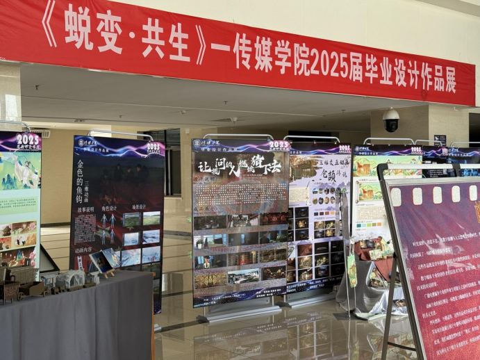 本次毕业设计展以《蜕变·共生》为主题,作品题材广泛、形式多样、视角独特,涉及海报设计、UI设计、文创周边、二维动画创作、三维动画创作、剧情片、纪录片等多种形式。指导教师代表对部分毕业设计作品进行了讲解与点评,学生代表依次参观了本次毕业设计作品展,并进行交流学习。