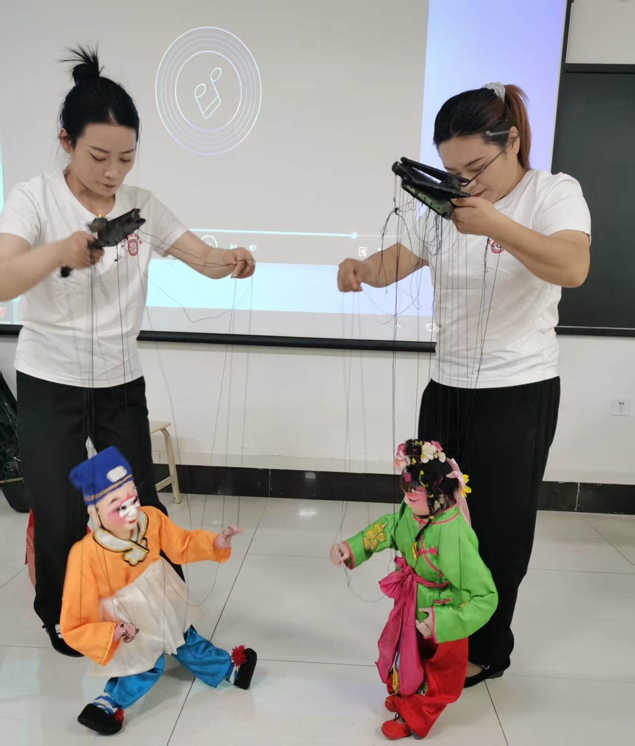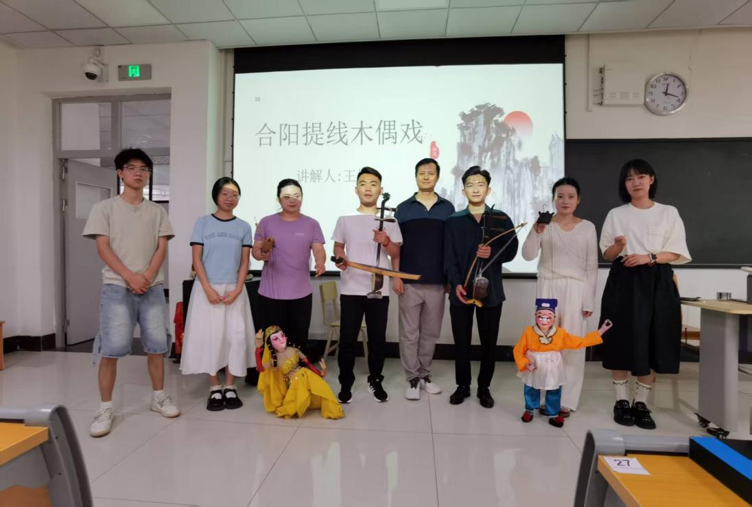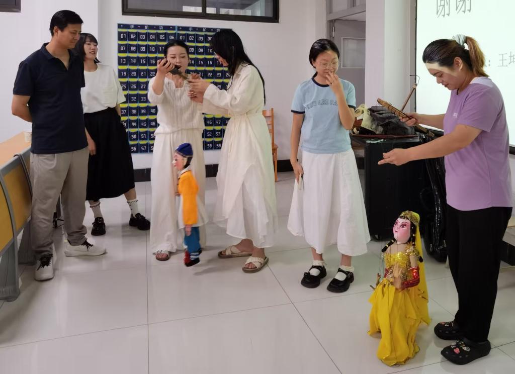 在上午的活动中,王坤从合阳提线木偶独特的唱腔及木偶道具为切入点,边讲解边安排演员进行现场表演,生动鲜活的讲解了合阳提线木偶的起源、剧团的历史辉煌及当前的发展现状。同时,他们还带来了《卖货郎》《天竺少女》等经典剧目的展演,并指导学生亲自操作提线木偶道具,使师生真切感受到合阳提线木偶的独特魅力,也深刻感受到“台上一分钟,台下十年功”的艺术真谛。