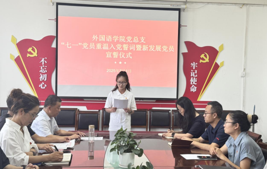 7月1日,外国语学院党总支举行“七一”党员重温入党誓词暨新发展党员宣誓仪式,外国语学院全体行政人员、新发展党员、发展对象代表参加。仪式由党总支书记武江波主持。