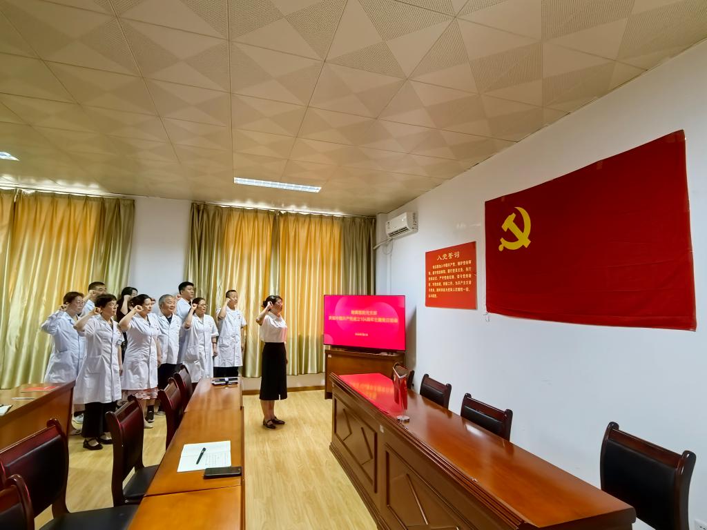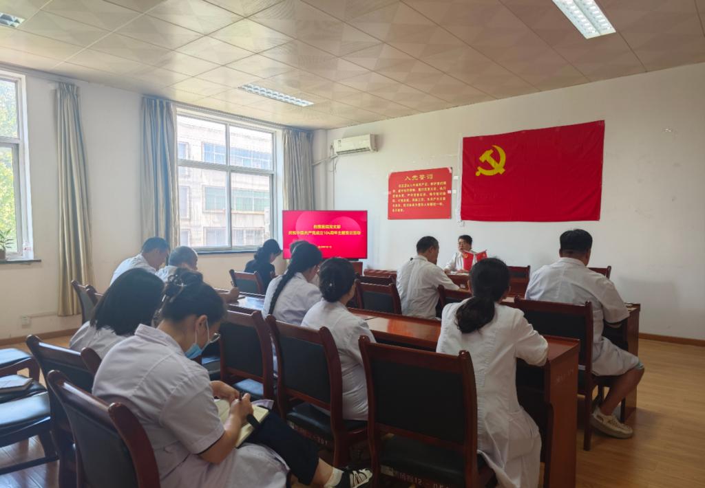 7月1日,附属医院党支部全体党员、入党积极分子及流动党员齐聚医院三楼党员活动室,举行了一场庄严而热烈的“医心向党践初心 健康护航担使命”主题党日活动,庆祝中国共产党成立104周年。