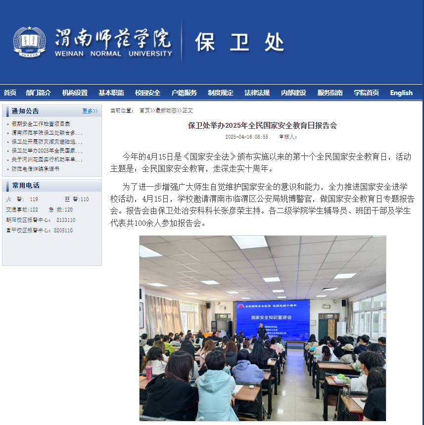 加强与渭南市国家安全局、内保大队、交警大队、临渭分局站南派出所、富平县东华派出所的沟通协调,积极开展国家安全、反电诈、禁毒宣传月、安全生产月等各类宣传教育活动。积极开展校园电动车专项治理行动,增划了安全停车区域,启动电动车校园通行标识办理工作。同时进一步加强校园机动车管理,制作悬挂有序停放提示标牌,强化违停处置,有效实施“缓堵保畅”。严格门禁管理,实行进入校园验证制度,陌生人来访登记率达100%,对外来车辆进行开箱检查,把好入口关。开展了实验室安全大检查活动;对朝阳校区大门外的出租车乱停乱放、拉客及商业摊位进行了专项治理;积极开展矛盾纠纷排查和安全隐患排查,组织校内商业网点安全专项检查6次,排除安全隐患30余处。统筹安排,精心组织,实现重点区域化专人盯防,圆满完成四六级英语考试、审核评估、田径运动会等安全保卫工作。
