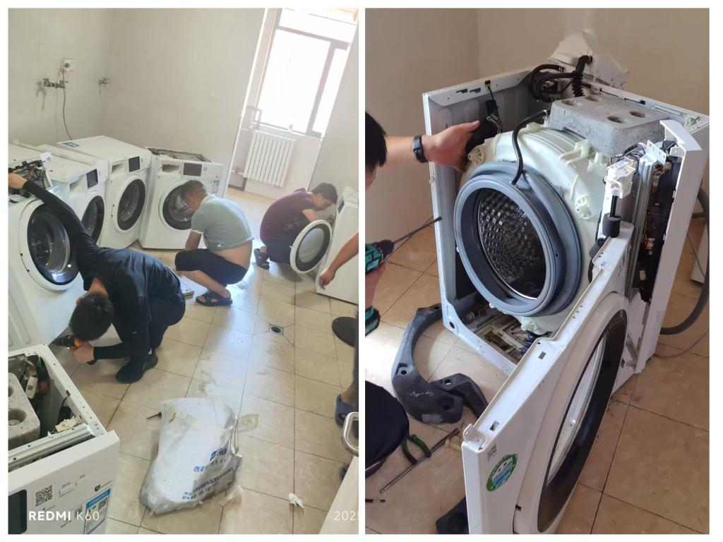 富平校区的洗衣设备维护现场,同样是一派忙碌景象。工作人员逐台对洗衣机、烘干机进行“全身体检”:先小心翼翼拆解面板与内部组件,用专用清洁剂反复擦拭滚筒内的残留污渍,再仔细检查电路接口、传动部件的损耗情况,对老化零件及时更换。即便是滤网、排水管等易被忽略的细节,也一一疏通清理,确保设备运行时排水顺畅、噪音降低。经过这番“精修细养”,每一台洗衣设备都恢复了最佳状态,等待着新学期为师生提供高效便捷的服务。