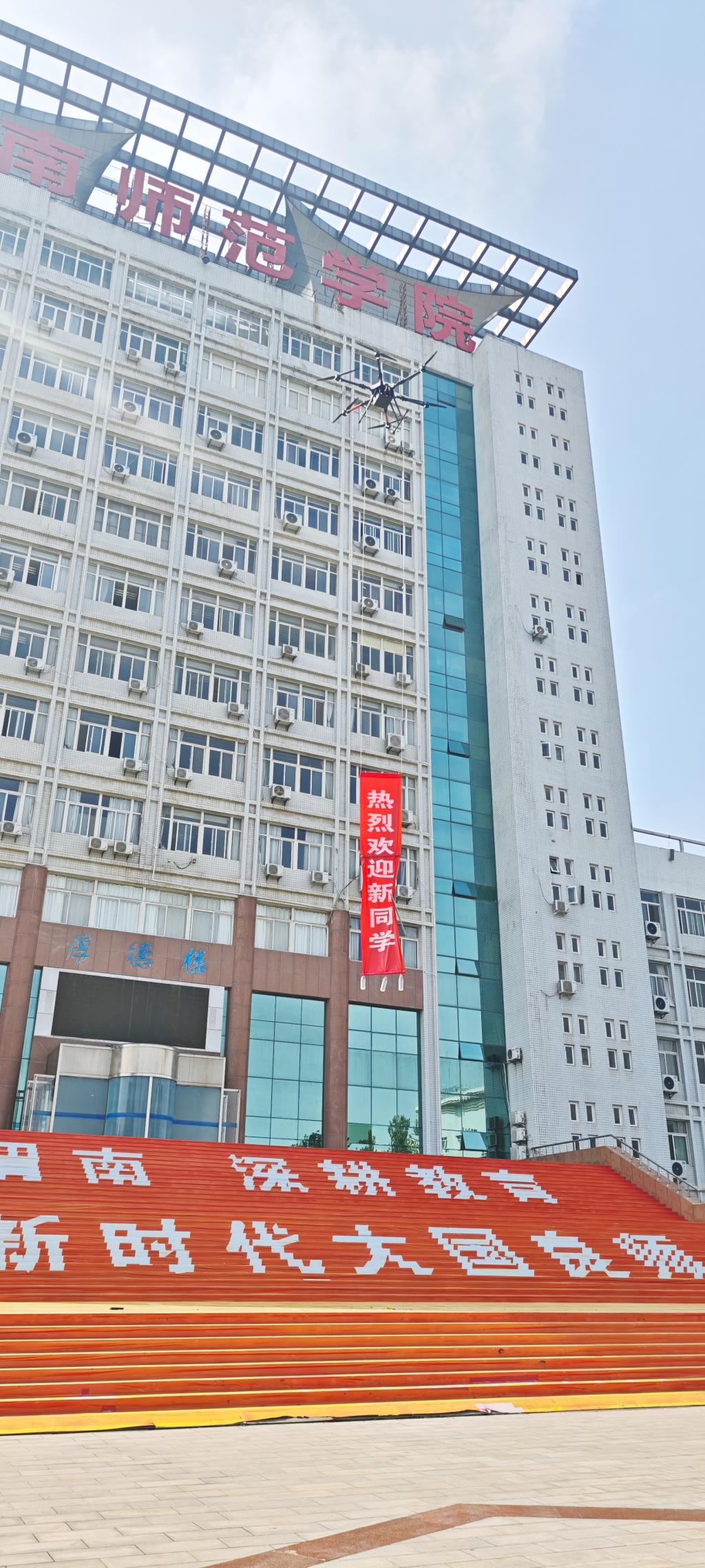 9月13日,best365迎来了2025级新生入学报到。继续教育学院别出心裁,利用无人机在学校主楼厚德楼上空悬挂“欢迎新同学”条幅,以创新科技的方式向新生表达期待与欢迎。