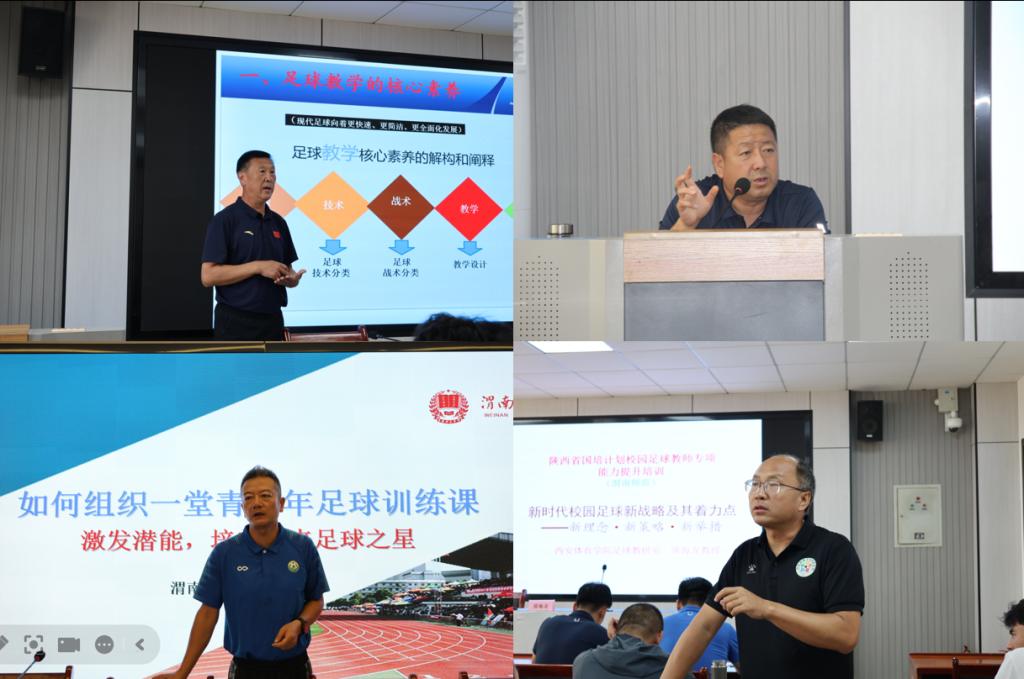 本次培训以“体教融合”为核心主题,紧扣校园足球教学与实践需求,围绕“足球教学训练核心素养”“青少年足球发展”和“竞赛组织与裁判法”等专题展开,特邀省内外多位专家授课。大连大学冯爱民教授、西安体育学院席海龙教授分别讲授了“足球教学训练核心素养的解构”“新时代校园足球发展战略与政策着力点”。西铁一中张八方老师分享了校内足球班级联赛的开展策略与实战经验,渭南市临渭区足球协会副主席陈学东深入讲解了足球裁判规则与判罚实务。