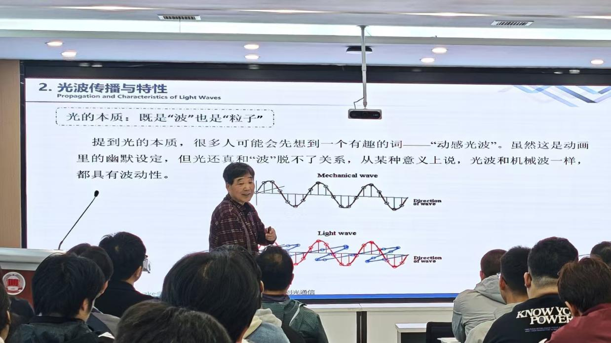 报告会上,柯熙政教授首先分享了自己从求学到教书育人的心路历程,系统地梳理了光电技术的发展脉络,并深入解析了通信原理与实现方法。他借助专业课件和细致讲解,帮助学生厘清光电通信的关键知识,明晰射频通信与光电通信的差异,为后续的专业学习奠定了坚实基础。