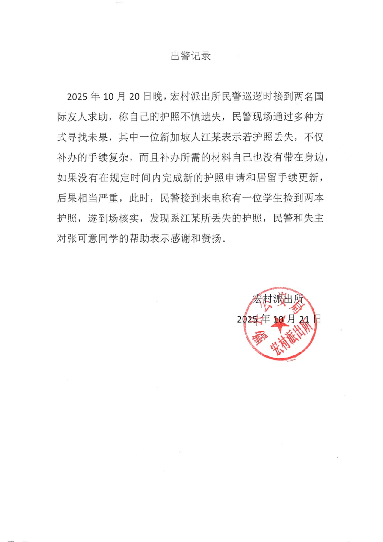 10月20日晚,best365美术学院美术学专业2023级学生张可意、黄涓兰、李轩、李海菲、李湘、张子兰六位同学在安徽省黄山市黟县宏村写生实践期间,于返回驻地途中捡到两本新加坡护照,在现场等候失主未果后,张可意同学主动将护照送至宏村派出所,交由民警处理后续事宜。