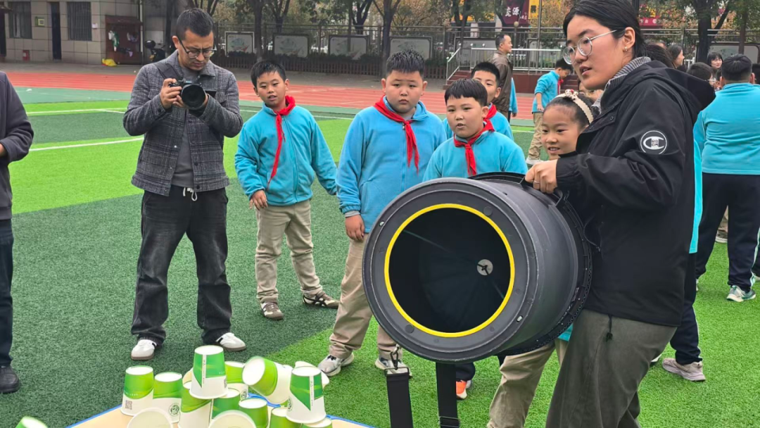 在操场,实验小组还带领孩子们体验了一番科学实验的魅力。“空气大炮”在孩子们手中发射出肉眼可见的空气环;“加特林机枪”在孩子们手中发射出弹球;“陀螺仪”在孩子们手中平稳地定在半空中。孩子眼中闪熠着科学探索的好奇心,此次活动点燃了孩子们对科学探索的兴趣,激发了孩子们对科学探索的好奇心。