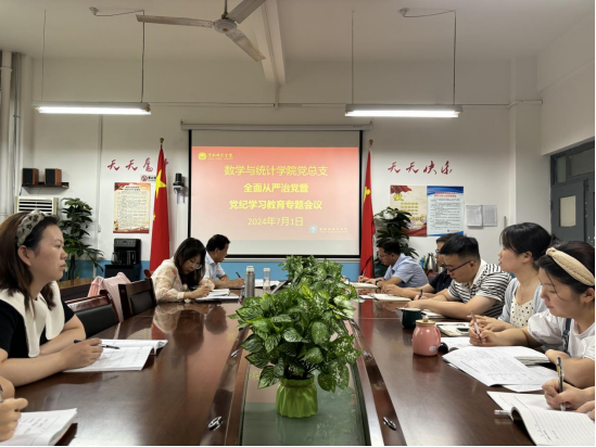 7月1日上午,数学与统计学院党总支在学院会议室召开全面从严治党暨党纪学习教育专题会议,学院全体行政人员参加,党总支书记武江波主持会议。