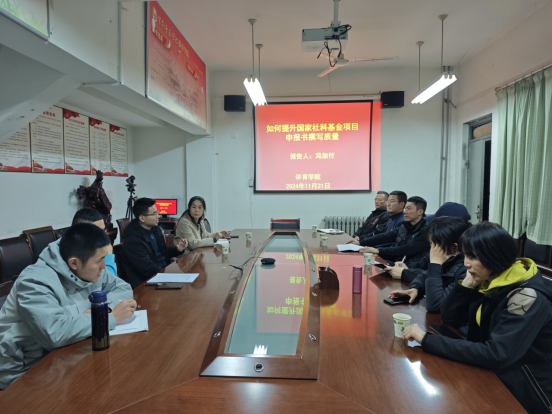 11月21日,体育学院邀请西安体育学院硕士生导师冯加付教授作“如何提升国家社科基金项目申报书撰写质量”主题报告会。学院领导和部分骨干教师参加,会议由副院长杨枭主持。