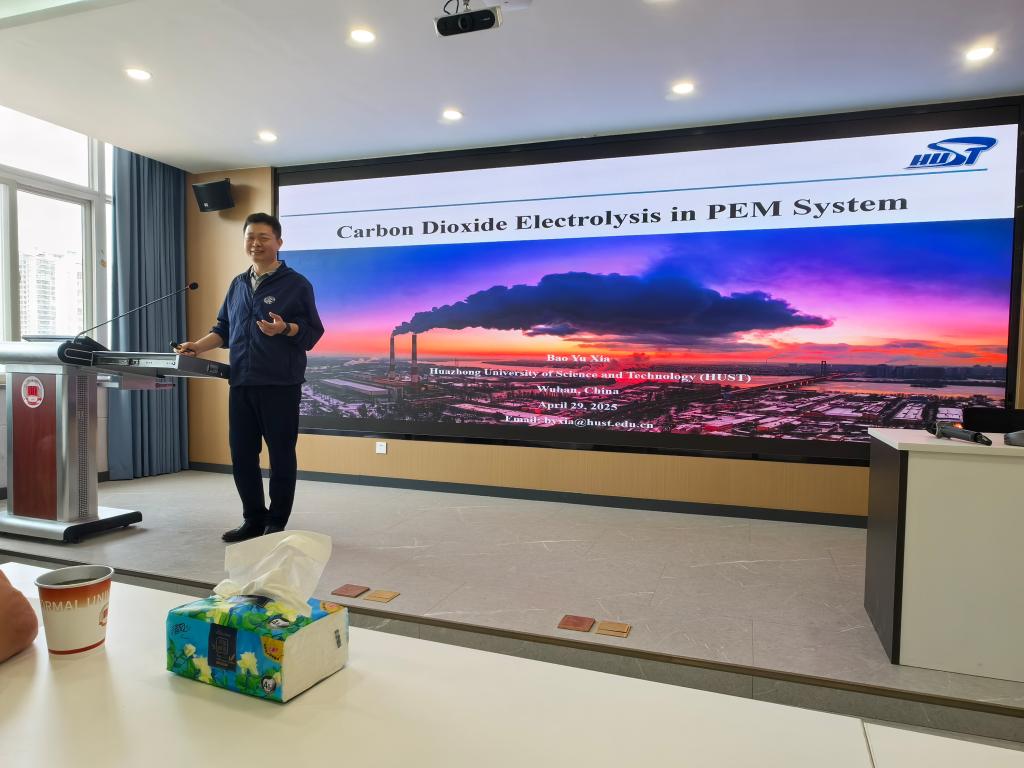 夏宝玉教授围绕质子交换膜系统,从催化剂设计、质子交换膜、阳极反应等维度,深入剖析电催化CO₂转化的失效问题,系统阐述实现高效稳定电催化CO2转化的设计思路与方法。报告结束后的互动环节,面对师生踊跃提问,夏教授一一耐心解答,还针对青年教师科研发展和学生成长给出实用建议。夏教授的报告内容充实、形式赏心悦目、讲解鞭辟入里,令在场师生收获颇丰。(通讯员 杨帆 杨珊 审核人 刘展晴)