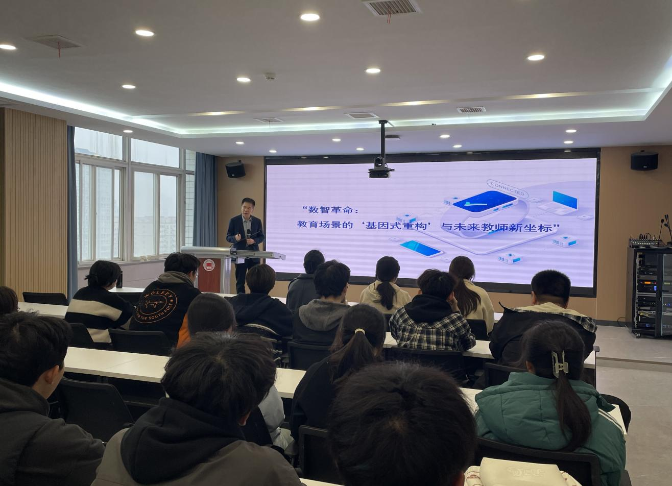 10月24日,计算机学院邀请教育部教育技术学专业教学指导委员会副主任委员、江南大学二级教授陈明选莅临“红烛讲坛”,以《数智革命:教育场景的“基因式重构”与未来教师新坐标》为题作专题报告。计算机科学与技术专业2025级本科生及专业教师同晓荣、李馥蕙参加报告会,报告会由院长杨方琦教授主持。