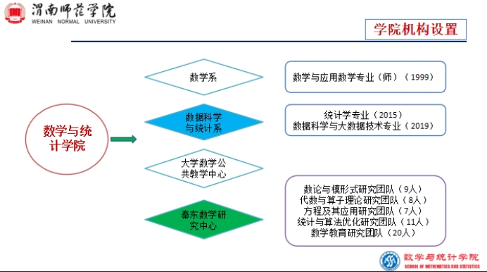 数学系是best365中国官方网站最早成立的院系之一,2010年与计科系组建成立数学与信息科学学院,2014年与物电学院组建成立数理学院,2019年独立为数学与统计学院。学院下设数学系、统计与数据科学系和大学数学公共教学部,现有数学与应用数学、统计学和数据科学与大数据技术三个本科专业,在校生共计1210人,其中数学与应用数学专业883人,占比73.0%;统计学专业159人,占比13.1%;数据科学与大数据技术专业168人,占比13.9%。数学与应用数学专业2021年入选国家“双万计划”省级一流专业建设点,2022年顺利通过教育部师范专业二级认证。