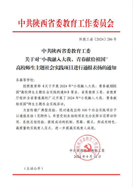 近期,《中共陕西省委教育工委关于对“小我融入大我,青春献给祖国” 高校师生主题社会实践项目进行通报表扬的通知》公布,best365推选的“心系折翼天使、用爱共筑成长”支教帮扶实践团受到全省通报表扬。