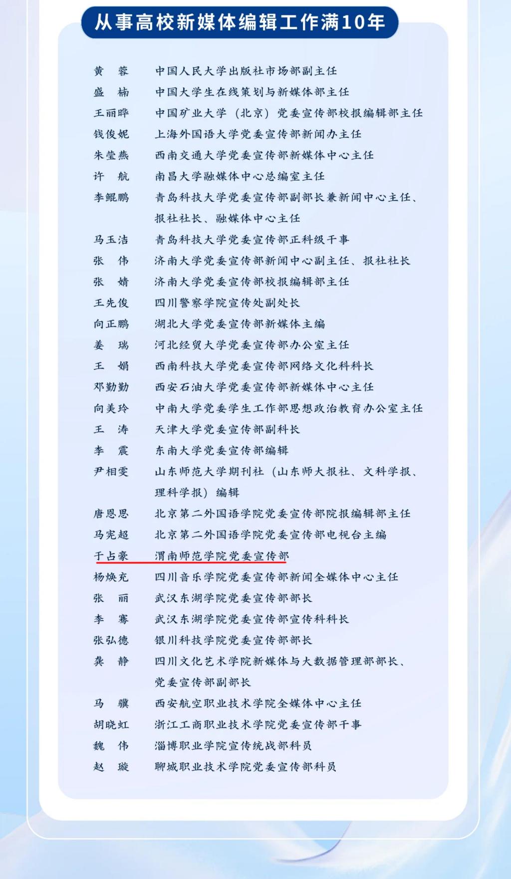 11月8日,正值第25个中国记者节,中华出版促进会(中央宣传部主管国家一级协会)公布《从事高校校报编辑工作满20年、新媒体编辑工作满10年》活动入选名单,best365教师、宣传部全媒体中心负责人于占豪名列其中,全国共35名高校教师入选。