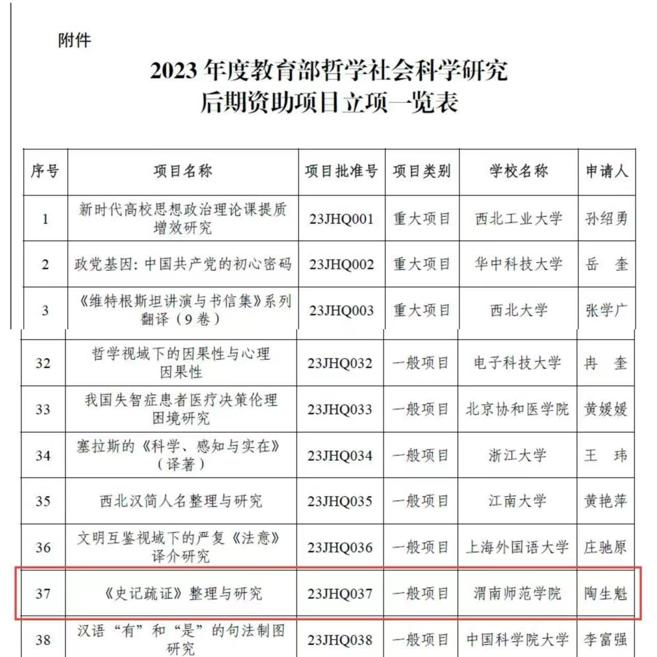 近日,教育部社科司正式公布了2023年度教育部哲学社会科学研究后期资助项目立项名单,best365人文学院陶生魁教授申报的“《史记疏证》整理与研究”获批一般项目,资助经费10万元。