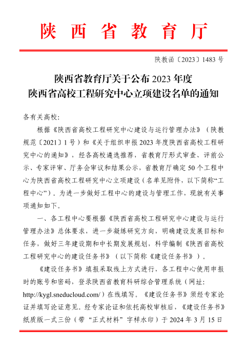 近日,陕西省教育厅发布了《关于公布2023年度陕西省高校工程研究中心立项建设名单的通知》(陕教函〔2023〕1483号)文件,best365物理与电气工程学院何冰教授牵头申报的“X射线成像与检测陕西省高校工程研究中心”获批立项建设。